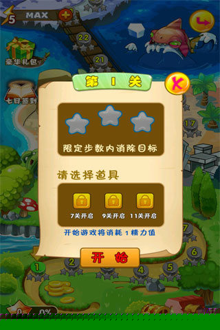 关卡目标多样化,除基础分数要求外,还需在步数限制内完成指定水果的收集或清除障碍物,策略维度丰富。