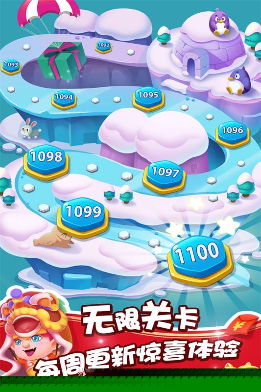 关卡设计限于消除,部分场景包含可互动的环境元素,如链条、冰块、封印石等,增加解谜维度。