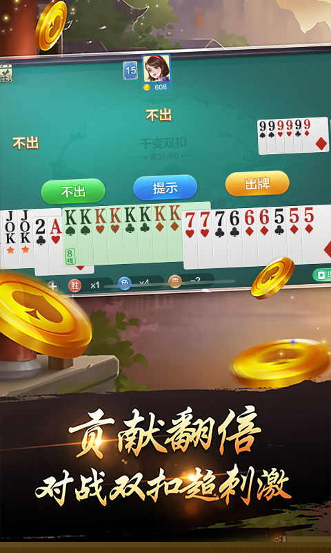 千变双扣是一款融合了传统双扣规则与丰富策略变化的棋牌游戏,游戏背景植根于江南水乡的休闲文化氛围,将扮演智慧牌手,在四人两两搭档的对局中,通过精妙的配合与出牌决策,争夺最终的胜利。核心主题围绕着团队协作与个人牌技的完美平衡展开,每一局都如同一次智谋的博弈,考验着对牌型组合、局势判断以及与搭档默契沟通的综合能力。