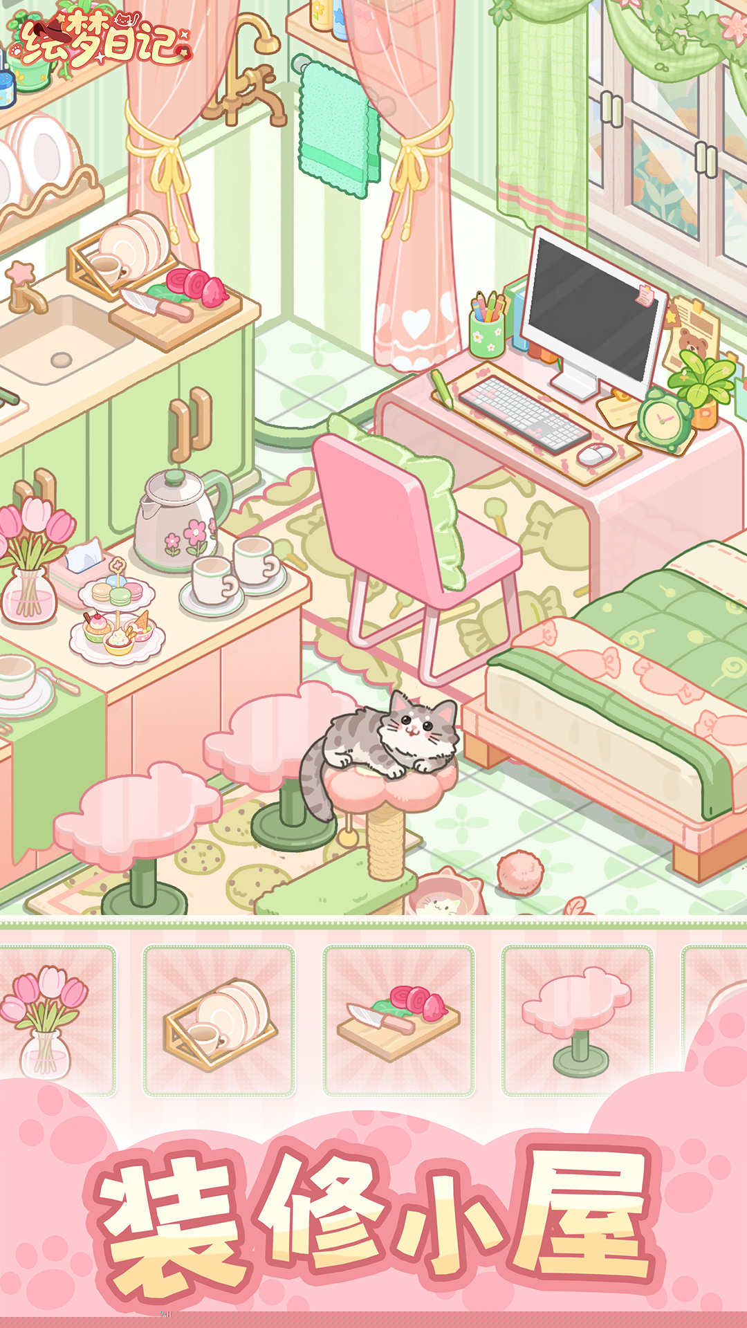 绘梦日记是一款将模拟经营、自由装修与少女换装巧妙融合的治愈系生活模拟游戏,被一只神秘的魔法小猫引领至一座亟待复兴的破旧小店。在这个充满无限可能的梦幻空间里,时间仿佛放缓了脚步,每一处角落都等待着被赋予新的生机与故事。从修复斑驳的墙面到布置温馨的家具,从为来访的客人提供贴心的服务到精心搭配每日的服饰,游戏构建了一个远离喧嚣、专注于创造与成长的宁静港湾,让在亲手搭建的治愈星球中,收获一份纯粹的满足与安宁。