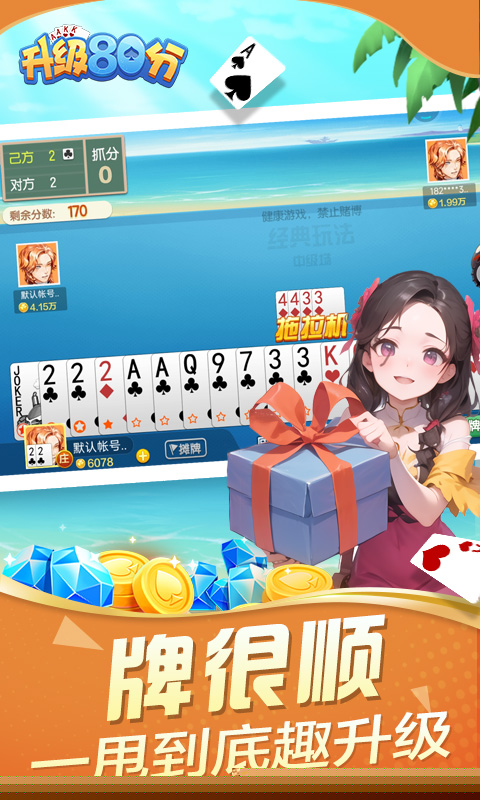 升级80分是一款融合了策略、配合与竞技乐趣的经典四人结对扑克游戏,规则脱胎于传统的拖拉机玩法,在保留抢分升级核心机制的基础上,通过现代化的呈现方式与丰富的模式变体,为构建了一个充满智力博弈与团队协作的牌桌战场,以两副扑克牌为基础,两位组成一队,与另一队展开对抗,目标并非简单争上游,而是通过精确的计算、默契的配合以及对主牌与副牌的控制,尽可能多地获取分数,并最终实现从低级到高级的升级过程,这种独特的胜负逻辑赋予了游戏持久的吸引力与深度。