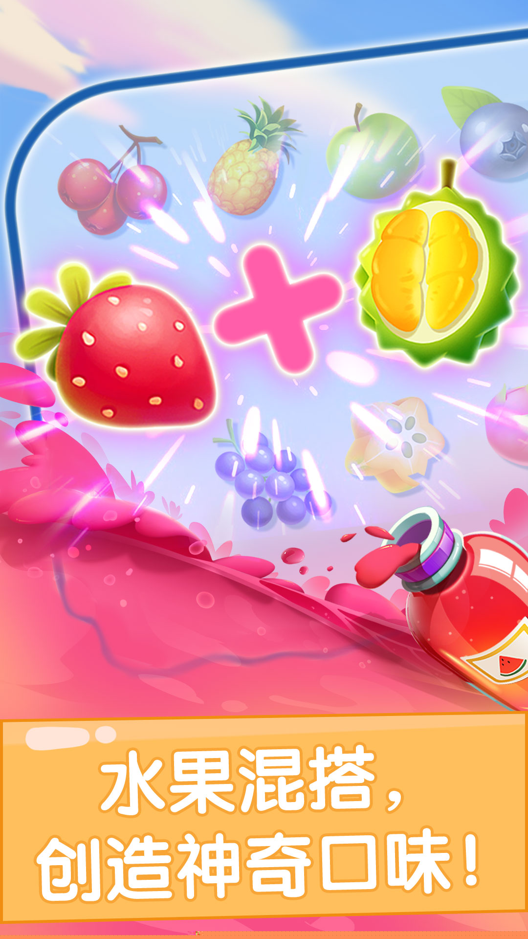 提供超过十种色彩鲜艳的水果素材与多样化的瓶子、标签,支持无限制的自由组合,鼓励个性化创作表达。