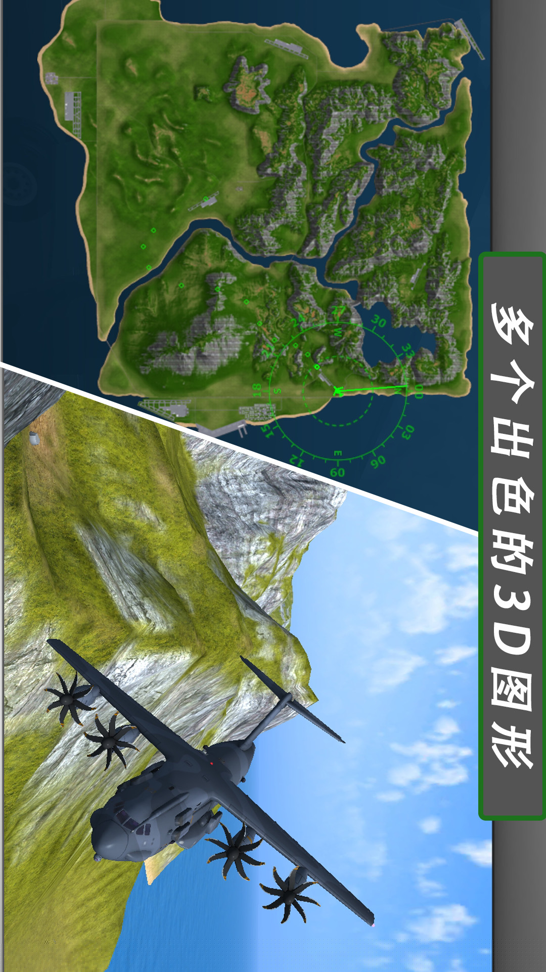 构建包含多个岛屿与众多机场、临时跑道的广阔可探索空域。