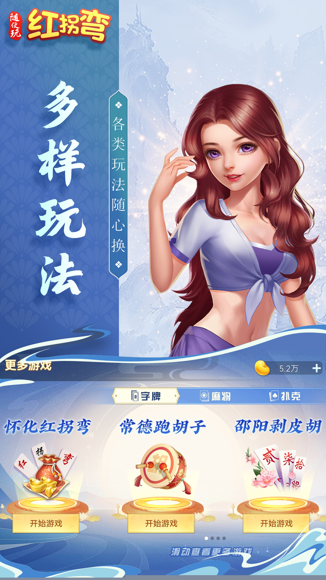 随便玩红拐弯是一款融合了湖南、广西地区多种民间字牌玩法的休闲竞技游戏,以怀化红拐弯规则为核心,构筑了一个充满地方文化气息的牌桌世界,复刻了地道的胡牌规则与方言音效,更将常德跑胡子、郴州字牌、永州扯胡子等十余种特色玩法汇聚一堂,让玩家在方寸牌局中领略湘楚大地的智慧与乐趣。丰富的福利活动与竞技赛事贯穿始终,为每一次出牌与胡牌增添了额外的惊喜与成就感。