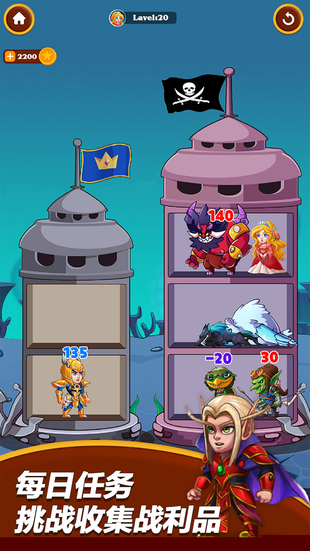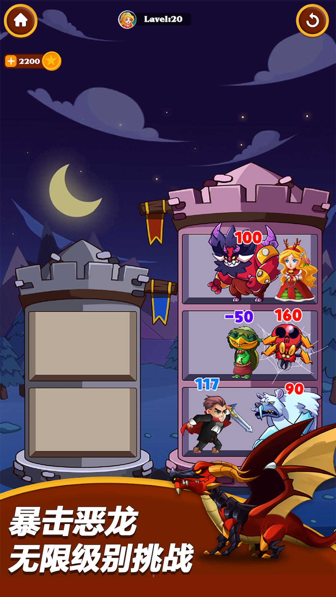 刀塔营救是一款融合了放置、策略与解密元素的角色扮演游戏,玩家将置身于一个充满挑战与奇幻色彩的世界。邪恶的巨龙掳走了公主,黑暗势力在王国边境蠢蠢欲动。作为被命运选中的指挥官,玩家需要集结并指挥风格各异的英雄,通过巧妙的布局与策略性的移动,在危机四伏的地图上展开一场惊心动魄的营救之旅,考验玩家的即时反应,更强调深度的战术规划与资源管理,每一次拖动英雄的抉择,都将直接影响战局的走向与最终的胜利。