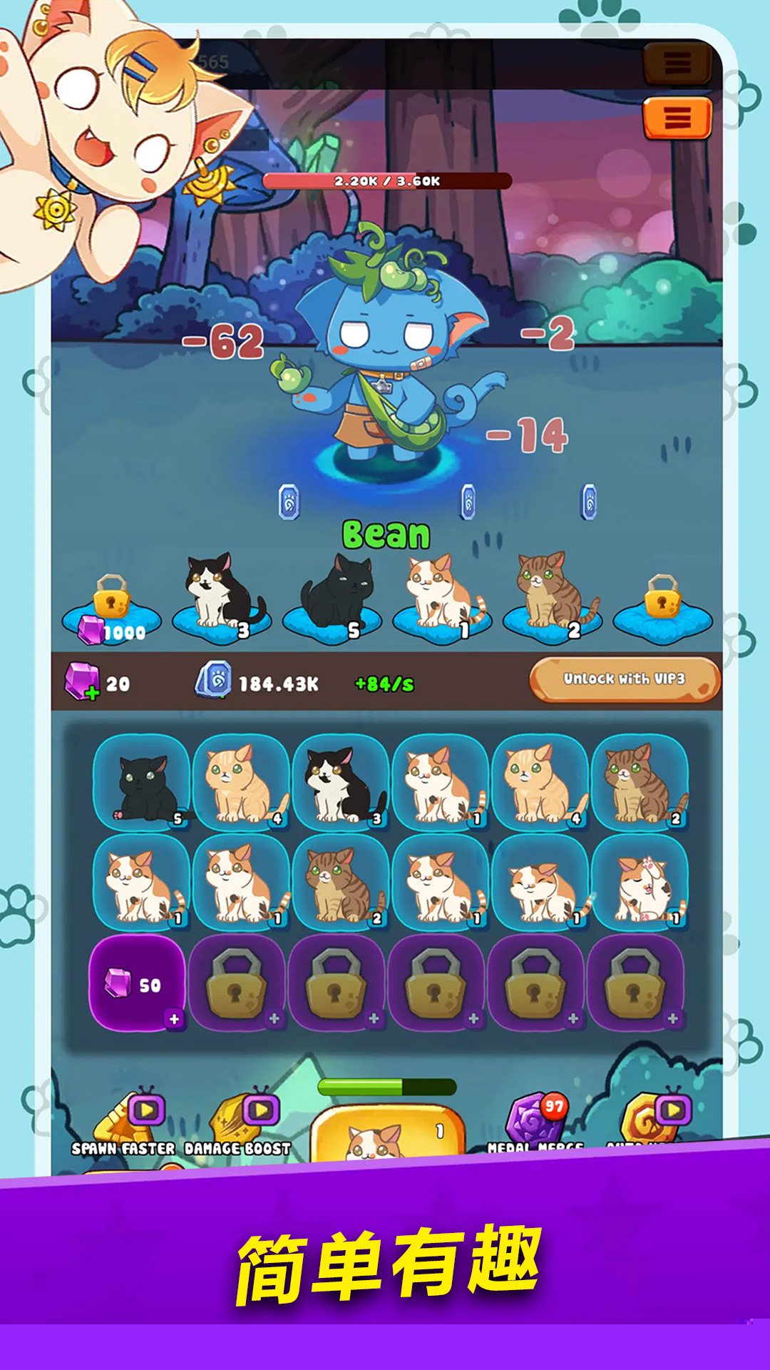 核心的合成进化机制,通过简单的合并操作,解锁更高阶的猫咪形态与能力。