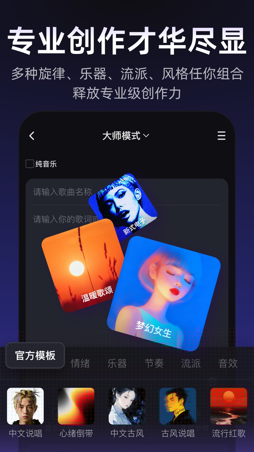 提供多种曲风的结构化歌词与作曲模板,辅助专业创作者快速搭建歌曲框架,AI在此基础上进行细节填充与优化,提升复杂作品的创作效率。
