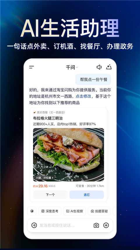 用户仅需输入一句话需求,即可直接触发外卖订购、酒店预订、餐厅查找乃至政务办理等流程,将自然语言理解转化为实际服务,简化了传统多步骤操作。