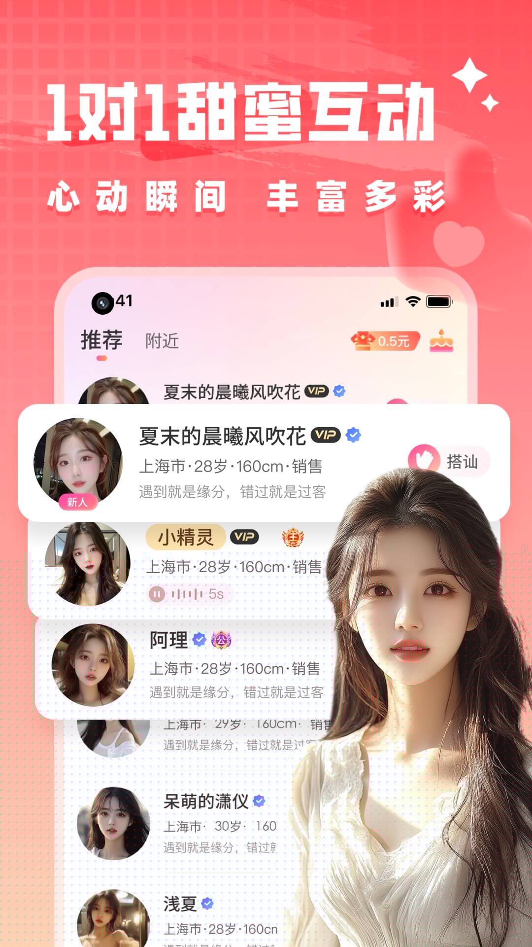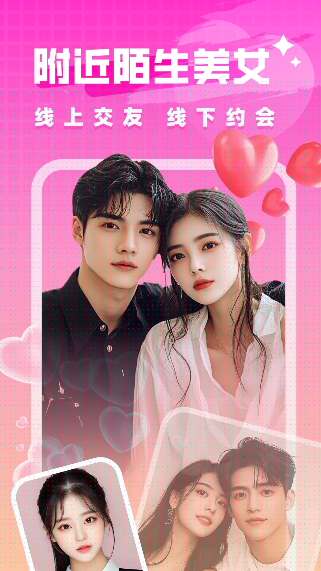 附近陌约会是一款专注于同城社交的移动软件,将即时聊天、视频通话、语音互动与动态分享等功能融为一体,为都市人群提供真实、便捷的线上交友体验,以地理位置为基础,智能推荐附近用户,帮助单身人士高效拓展社交圈层,从线上互动到线下见面,构建完整的社交链路,让孤独的灵魂找到共鸣,让有趣的相遇触手可及。