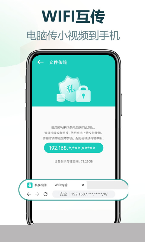 无需数据线,在同一Wi-Fi网络下,即可从电脑浏览器向手机内的私密空间安全传输大体积视频与图片文件。