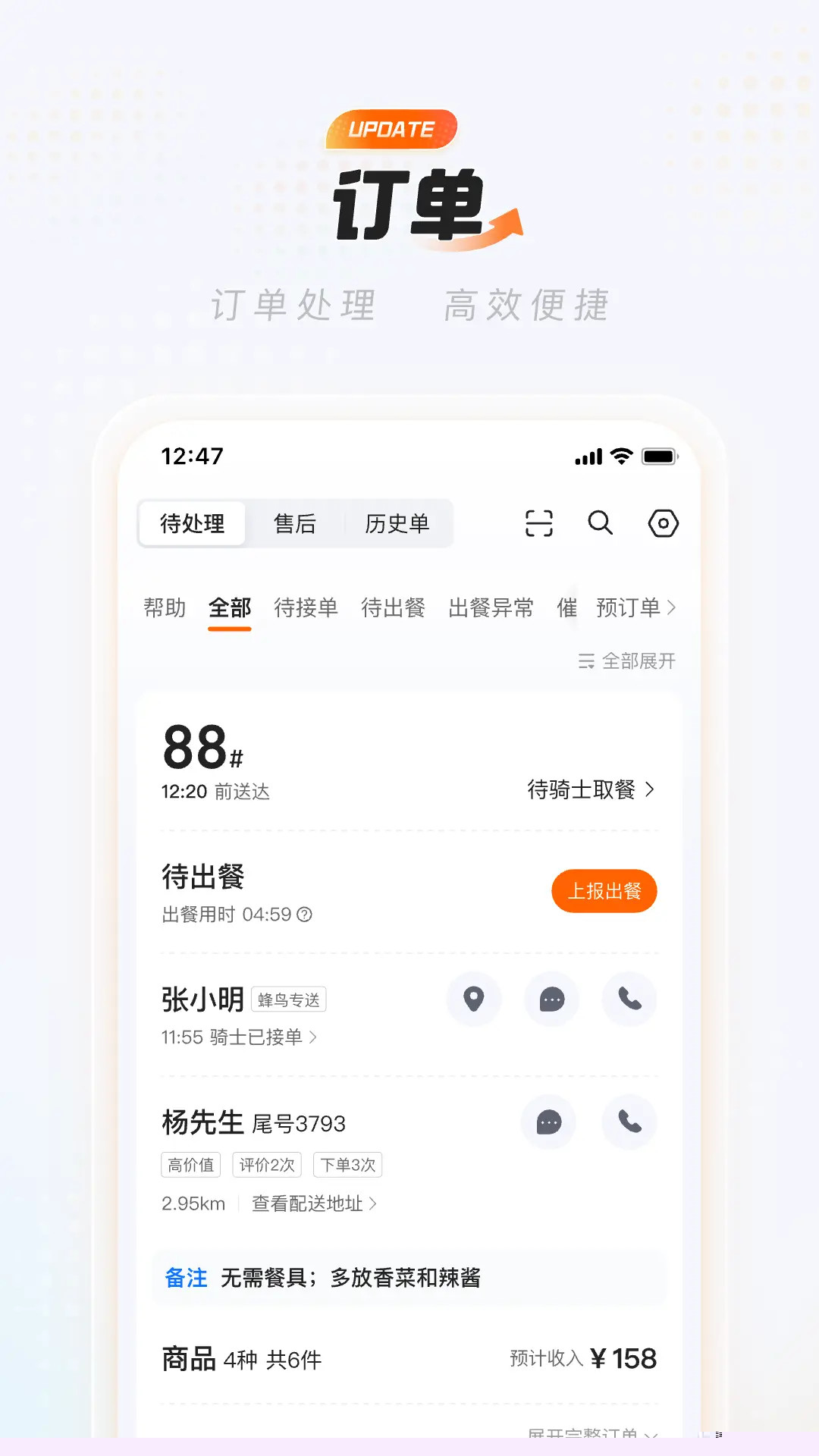 订单信息高度聚合,新单、历史单、索赔单与预订单同屏呈现,便于商家快速响应与处理。