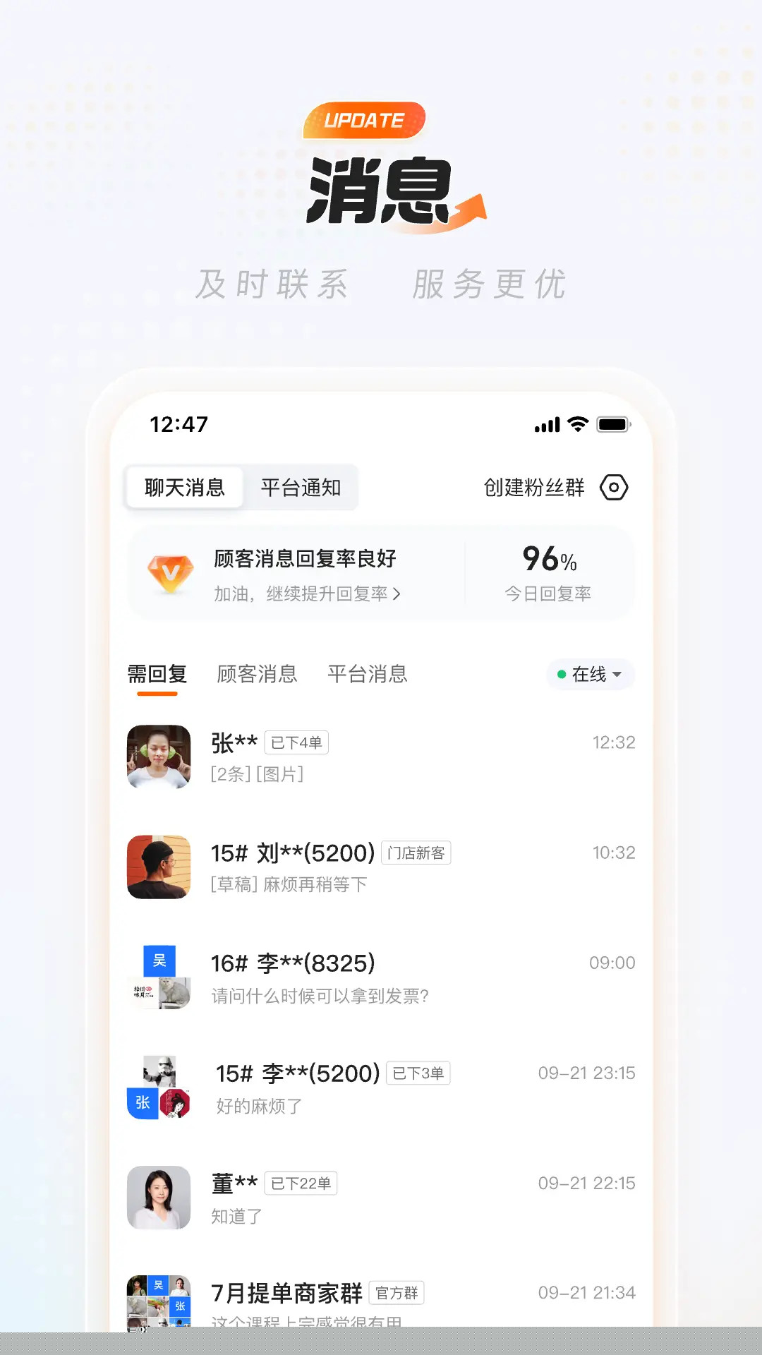 消息中心整合顾客咨询与平台公告,确保重要通知不被遗漏,提升沟通与服务效率。
