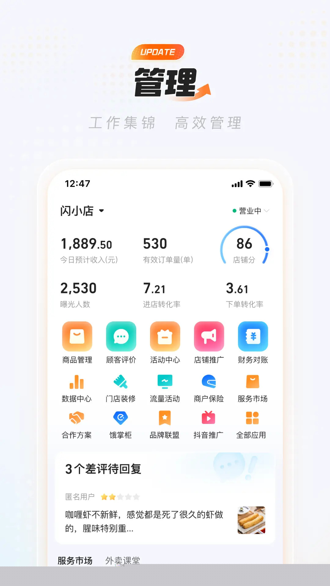 从商品上架下架、评价回复到门店页面视觉设计,提供了完整的后台操作入口,直接应对日常运营中的各类调整需求。