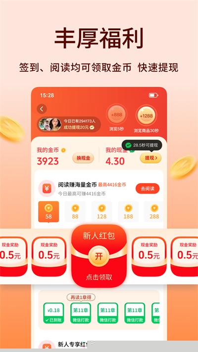 阅读或者听书可以赚取海量金币,金币可以兑换成现金