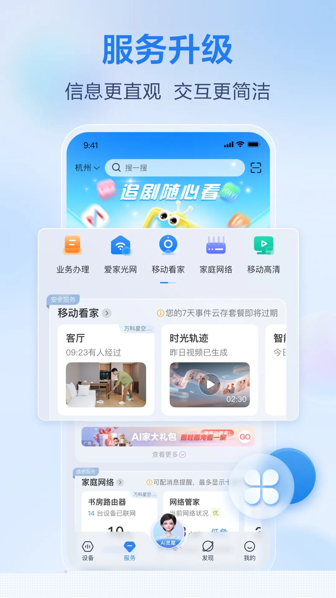 深度整合中国移动通信与宽带资源,提供从网络诊断到业务办理的全链路家庭服务。