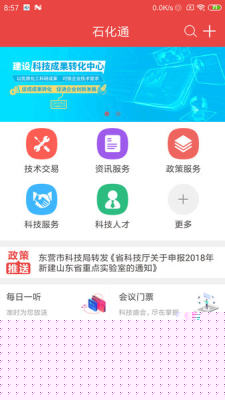 首页集成了技术交易、资讯服务、政策订阅、项目日历、会议门票等众多业务入口,并设有政策信息轮播展示,形成清晰高效的服务导航中心。