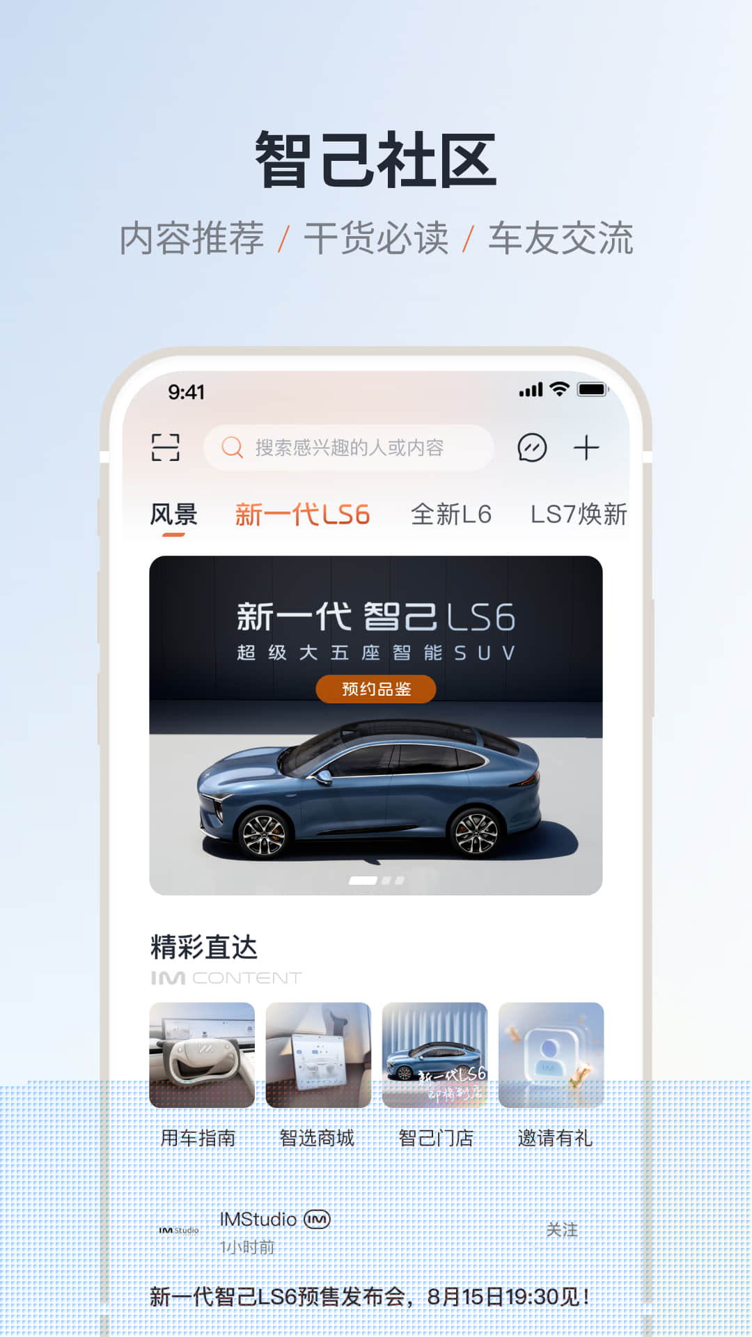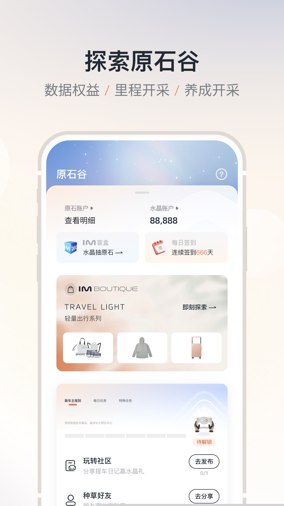 IM 智己是一款融合了数字社交、虚拟探索与智能车联的创新软件,为追求个性与生活品质的用户构建一个多维度的互动空间,核心在于连接拥有相似价值观的个体,通过丰富的线上社区与虚实结合的探索玩法,让每一次互动都充满惊喜,每一次出行都承载意义,重新定义了人、车与数字世界的关系。