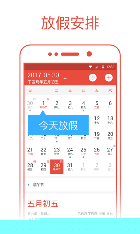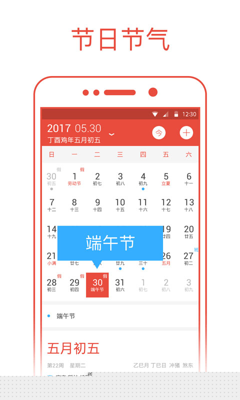 日历中对国家法定节假日、传统民俗节日、二十四节气等进行醒目标注,点击可查看其由来与习俗。