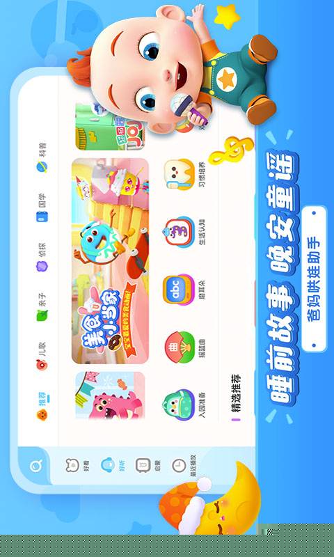 情绪管理工具:针对幼儿常见的情绪波动场景,如烦躁、哭闹、分离焦虑等,提供相应的舒缓儿歌与故事,起到有效的安抚作用。