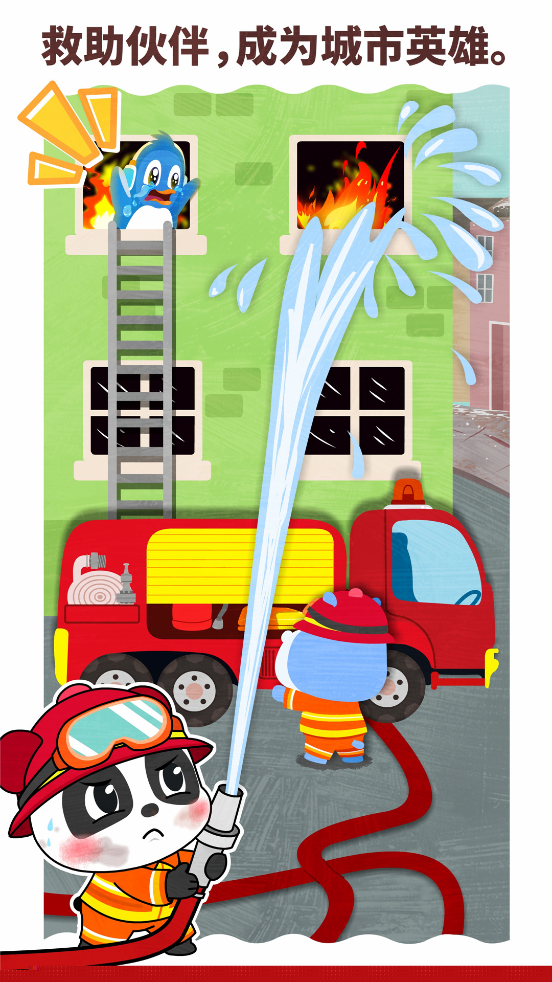 儿童需在特定职业场景下完成一系列连贯任务,作为消防员需驾驶车辆、连接水管并最终扑灭火焰。