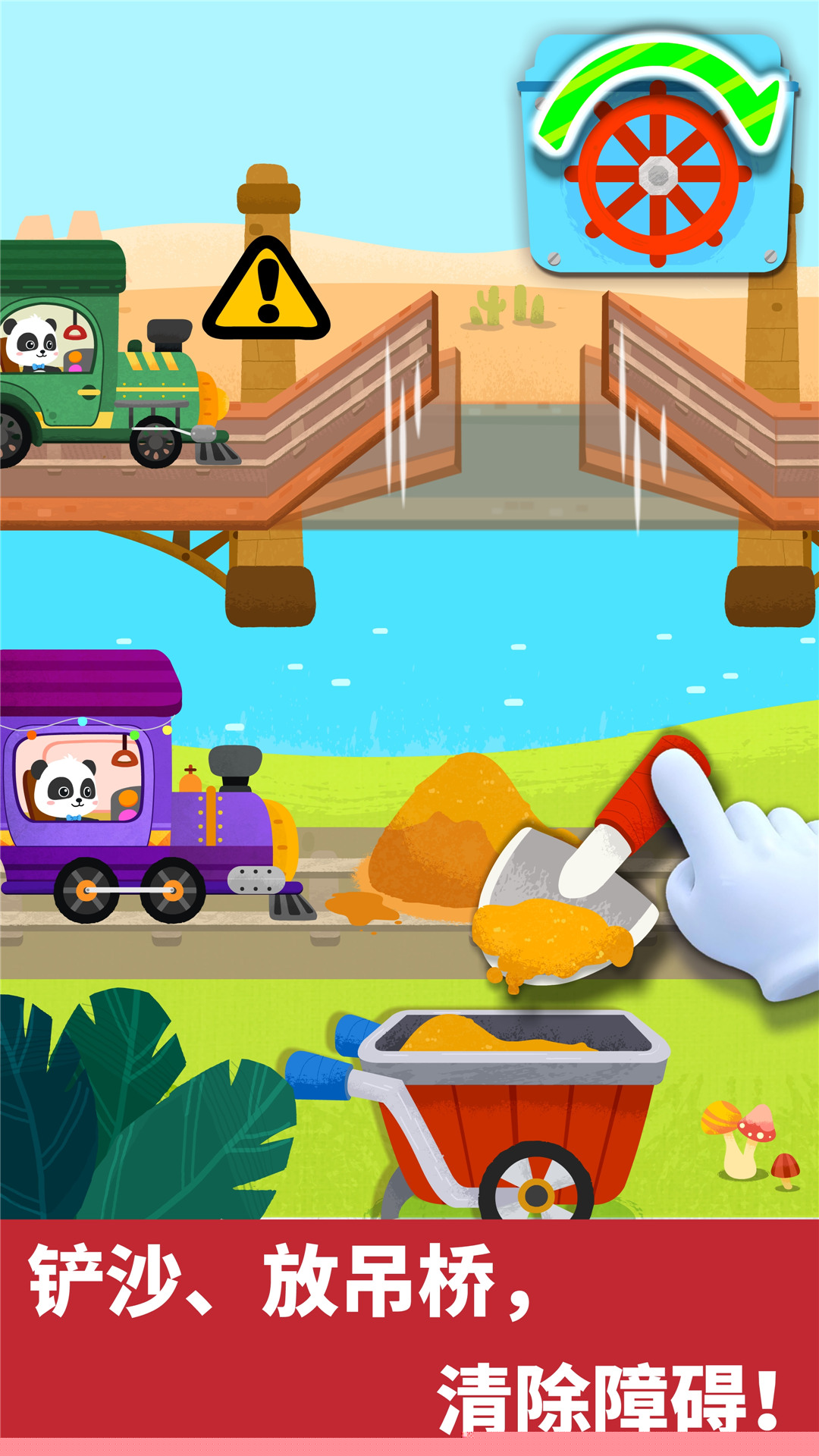火车行进途中会随机出现道闸落下、杂物挡路、铁轨损坏等七类关卡,需要孩子及时做出正确反应,如升起闸栏、清理路面或修补轨道,培养应急处理思维。