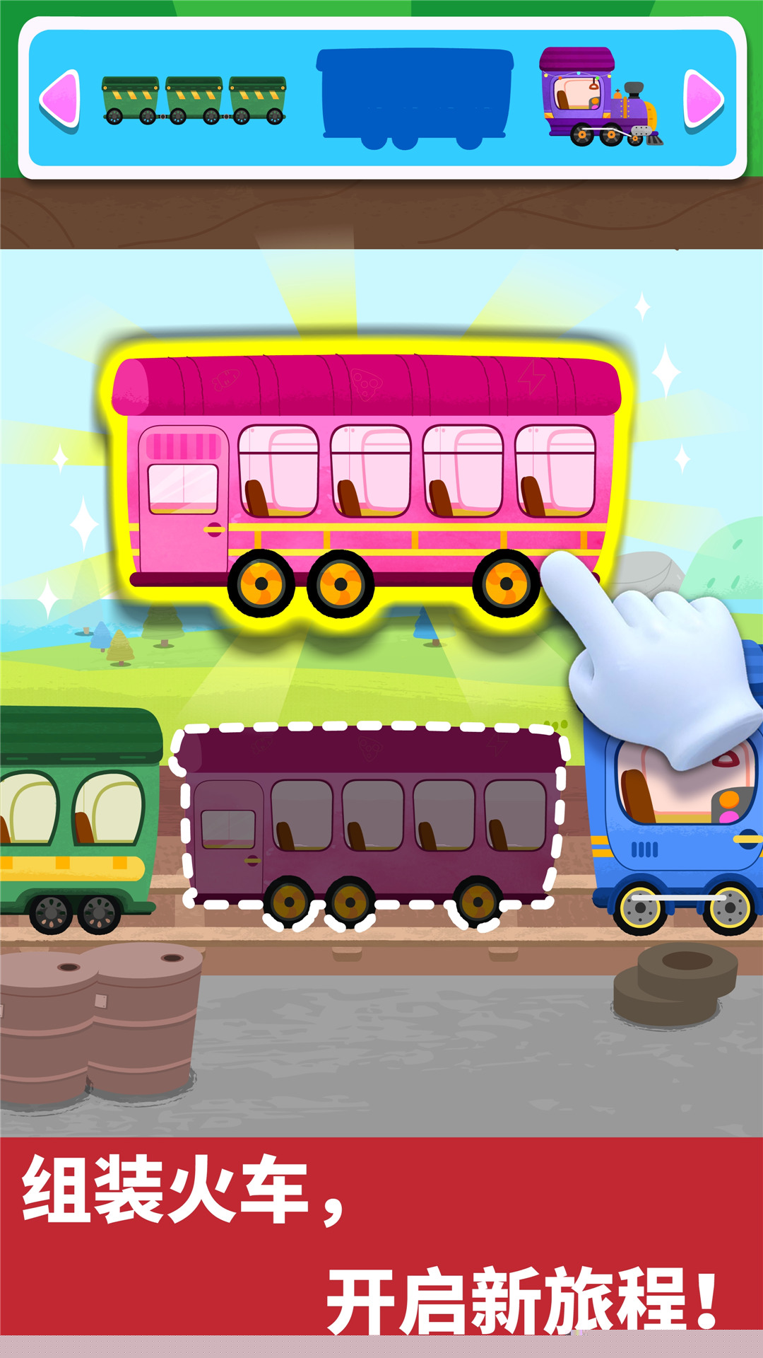 模块化火车组装系统,将车头、车厢等部件转化为可拖拽拼接的互动元素,直观揭示机械构造。