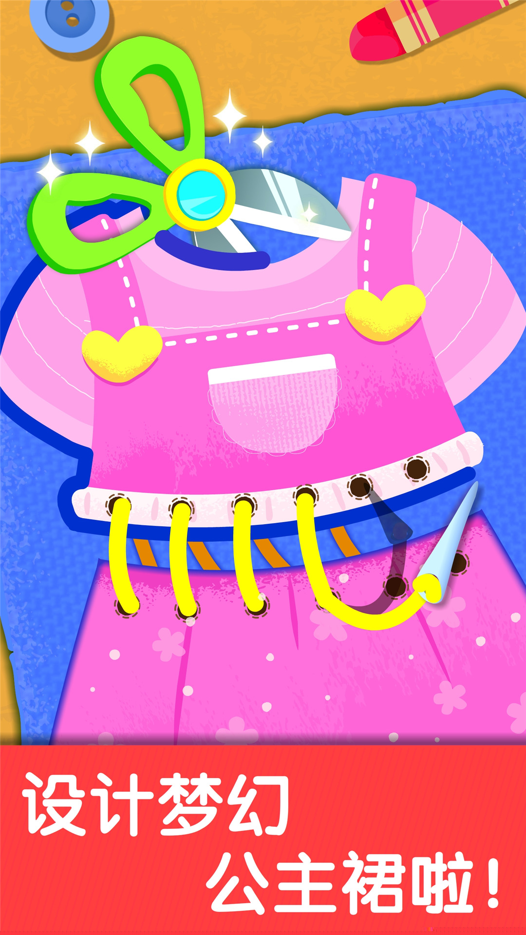 孩子可以扮演小小服装设计师,使用虚拟的剪刀和针线,为参加派对的小伙伴设计并缝制一件特别的公主裙或礼服。