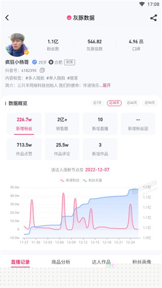 提供达人的历史直播数据、视频表现、粉丝增长趋势、粉丝性别年龄地域分布等深度画像。此功能解决了在寻找合作达人时信息不对称、判断依据单一的痛点,帮助用户从数据层面评估达人的真实影响力和粉丝匹配度,避免盲目投放。