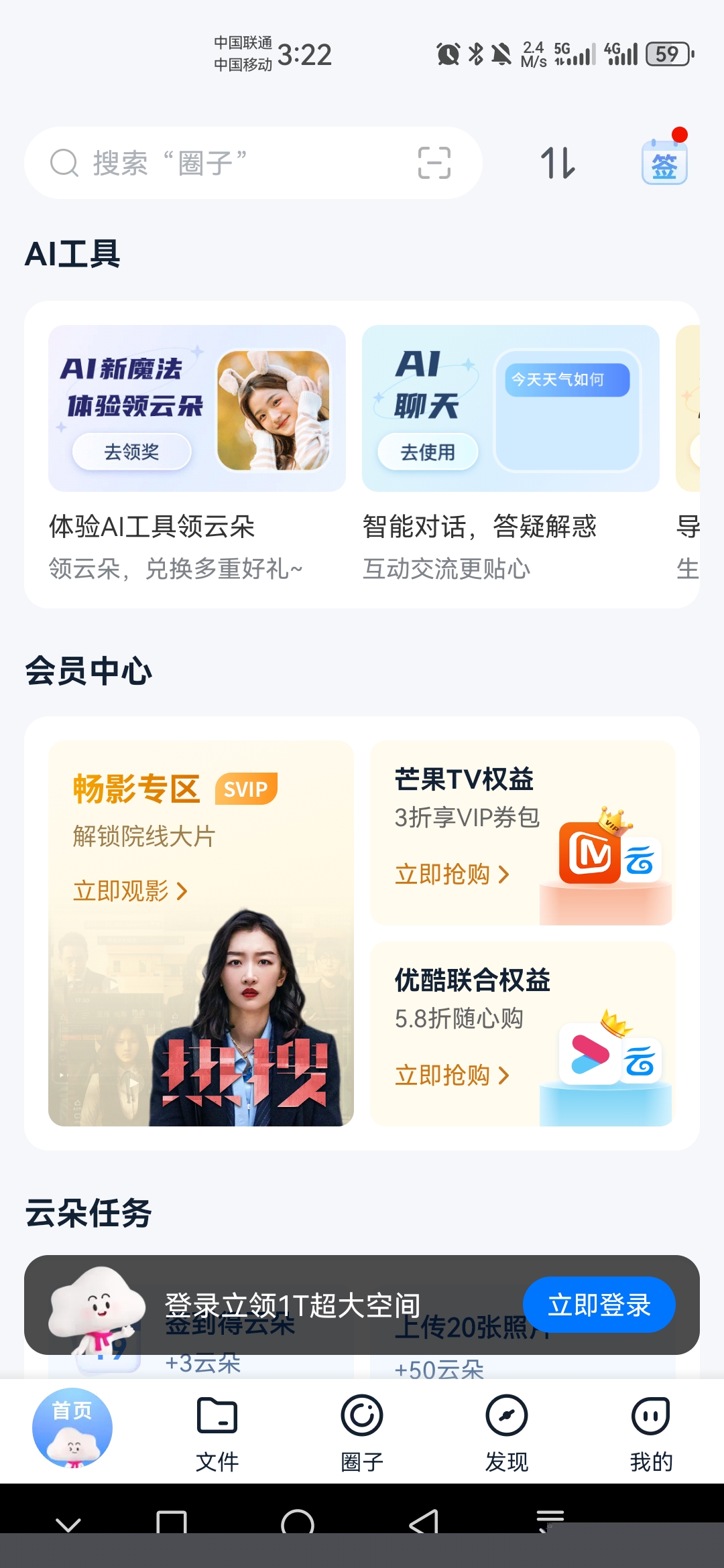 1.首先请在本网站本页面下载安装最新版本的中国移动云盘app,打开软件进入首页,第一种方式是点击立即登录。