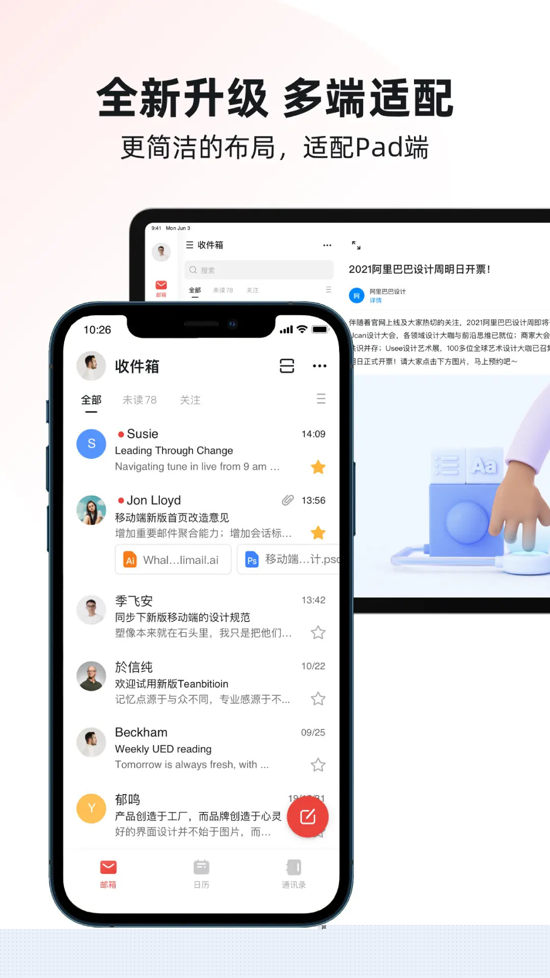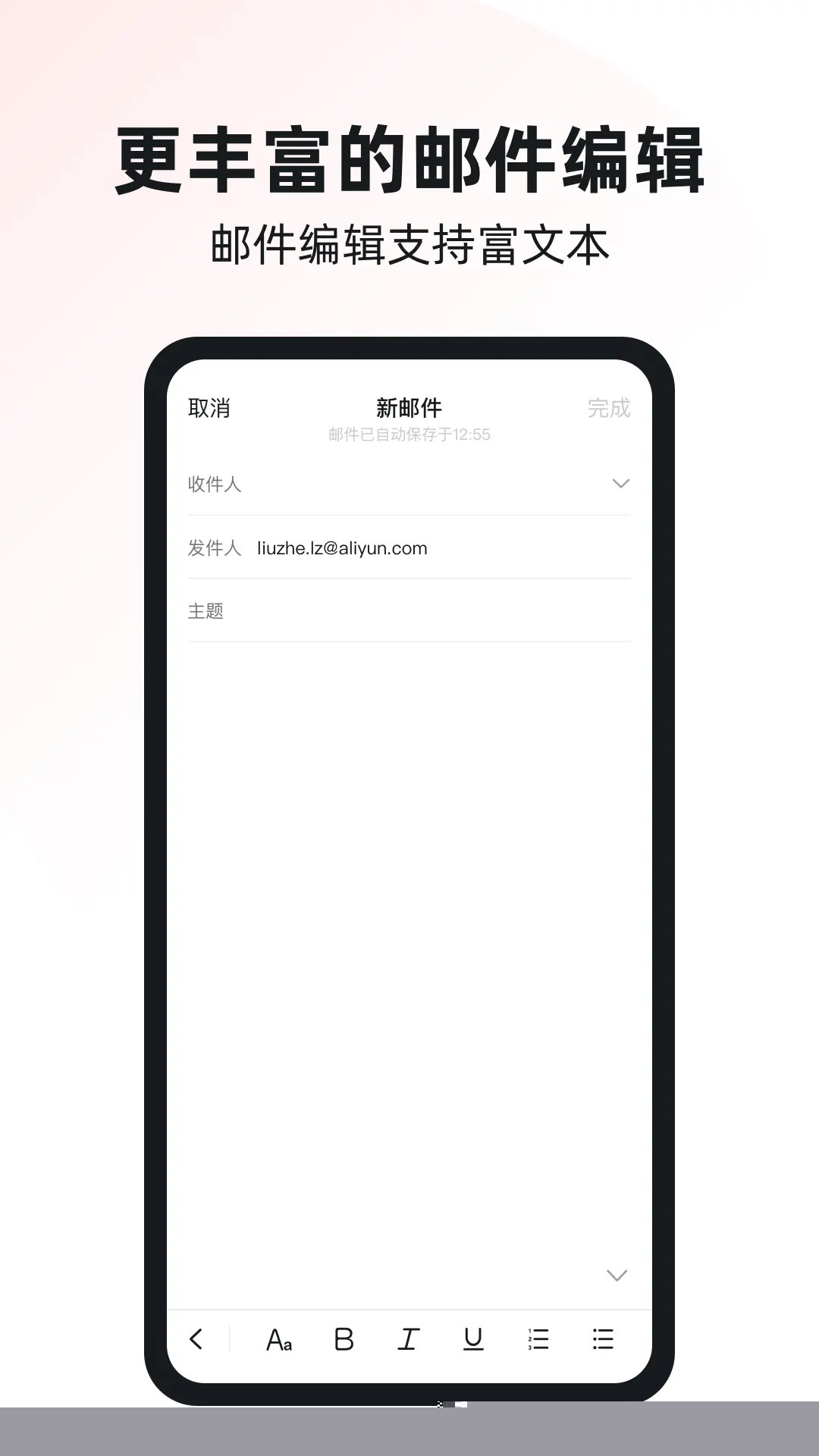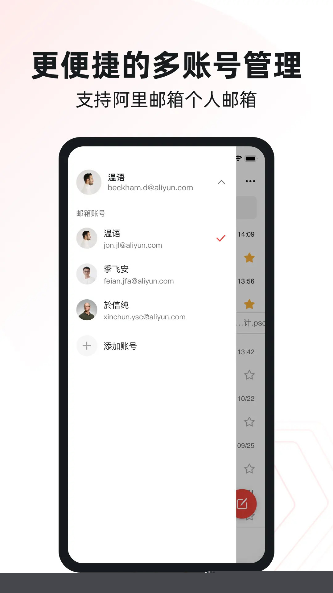 用户可在单一界面内管理阿里邮箱及其他第三方企业邮箱、个人邮箱,实现邮件的集中收取与发送,提升办公效率。