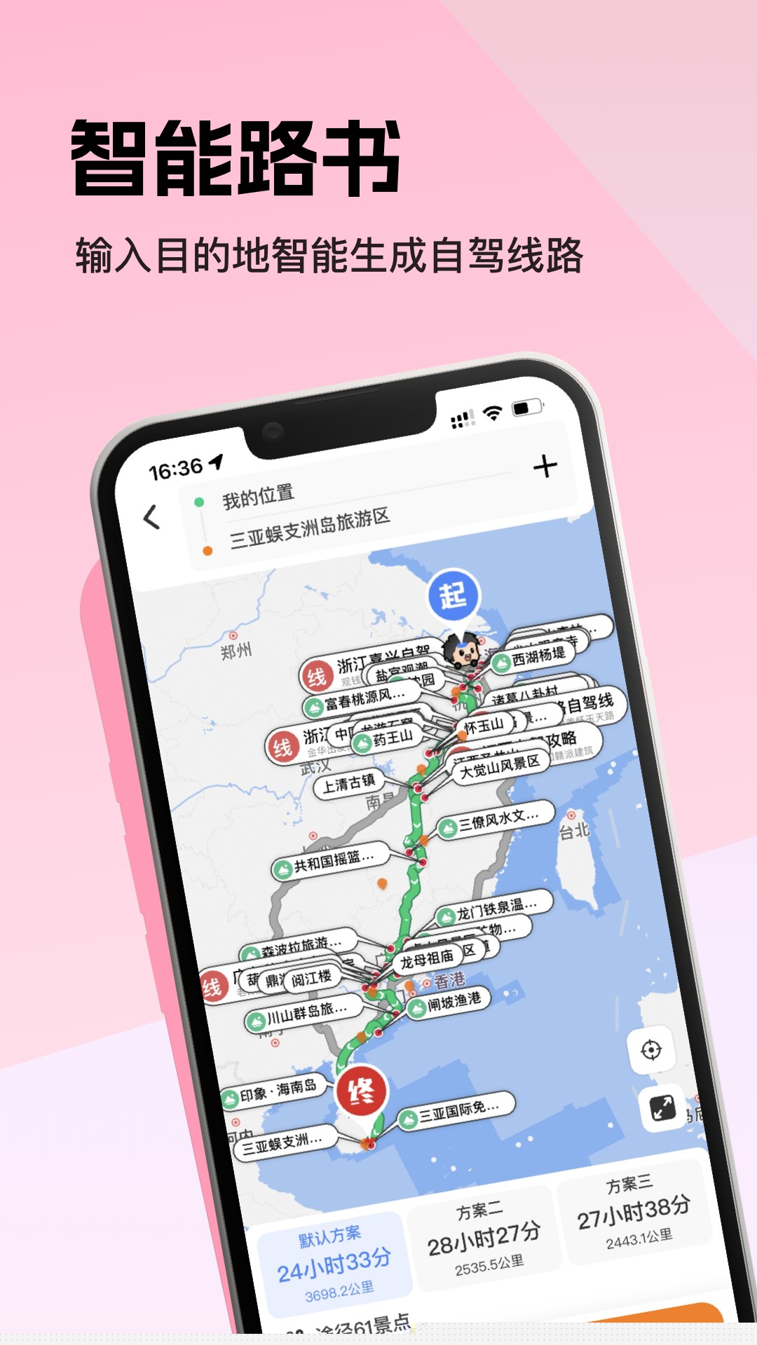 依据用户选择的起点、兴趣点和时间预算,自动生成多条备选自驾路线,并展示沿途所有景点信息。