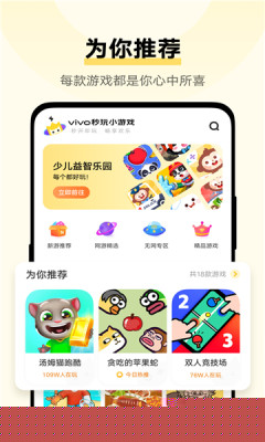 vivo小游戏中心是一款集成于vivo设备中的轻量化游戏聚合平台,为用户提供即点即玩的便捷游戏体验。平台汇聚了海量经过筛选的精品HTML5小游戏,涵盖休闲、益智、竞技、冒险等多种类型,无需下载安装即可快速启动,有效节省设备存储空间,设计初衷在于利用碎片化时间,让用户在通勤、课间或工作间隙能够轻松享受游戏乐趣,界面清爽直观,操作响应迅速,是vivo用户触手可及的随身游戏库。