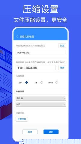 压缩文件创建:选择单个或多个文件或文件夹,快速创建为指定格式的压缩包,并可自定义压缩级别和分卷大小。