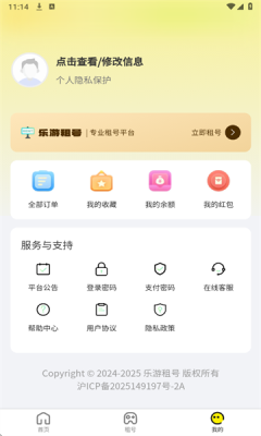 打开你的乐游租号,在个人中心点击登录。