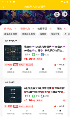 确定目标游戏后,系统会展示多个可租赁账号,查看号主描述并选择租玩。