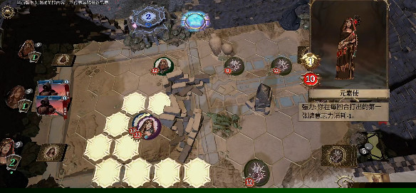 元素师能力卡:元素师可以通过积累魔法值在下回合开始获得1行动点,消耗2行动点。