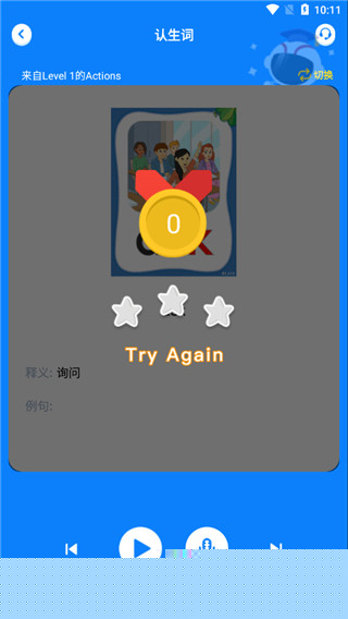 2、依次点击认生词,点击下方的播放按键,多读几遍之后点击麦克风按键,这个时候就是要自己读出来,后面还会根据你的读音来打分