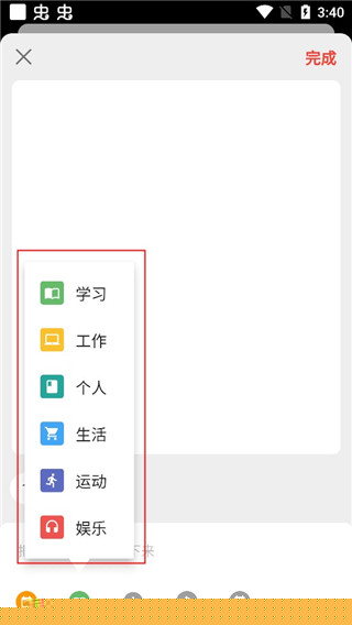 4、在这里可以选择自己计划的类型,其中包括:学习、工作、个人、生活、运动、娱乐。
