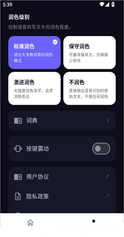 2、在设置中可以修改控制语音转写文本的润色程度。