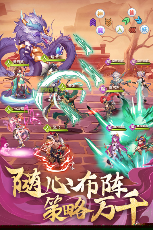 游戏采用经典回合制策略战斗,融合兵种克制与武将技能搭配,考验的临场布阵智慧。