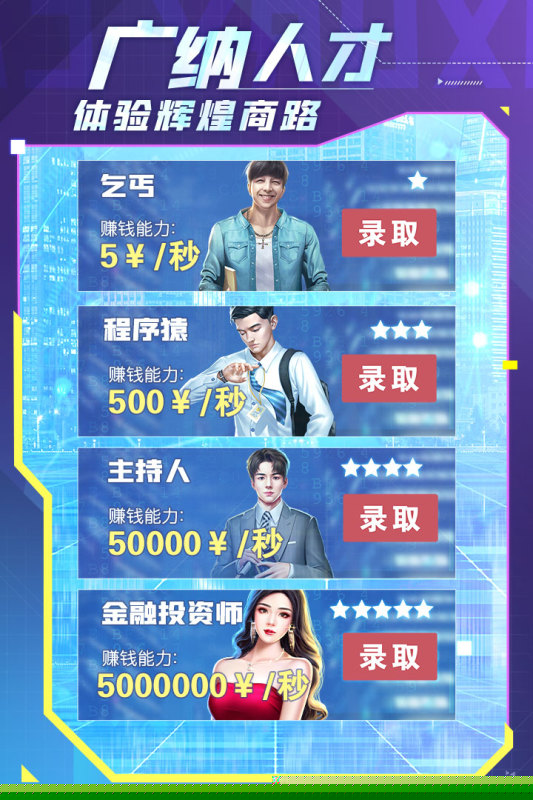 海量商业精英与名人角色以卡牌形式登场,每位都拥有独特的商业技能与背景故事,可被招募至麾下。